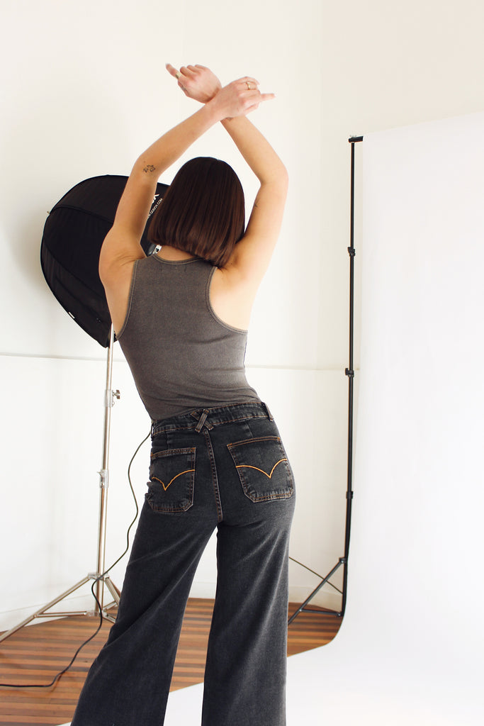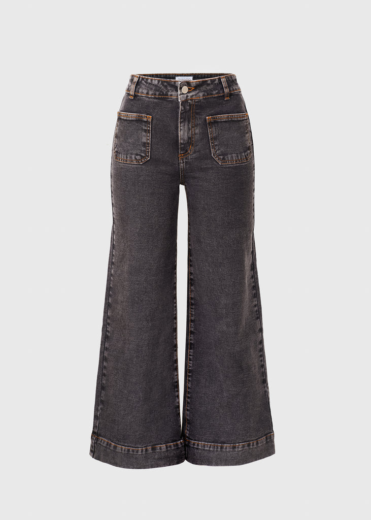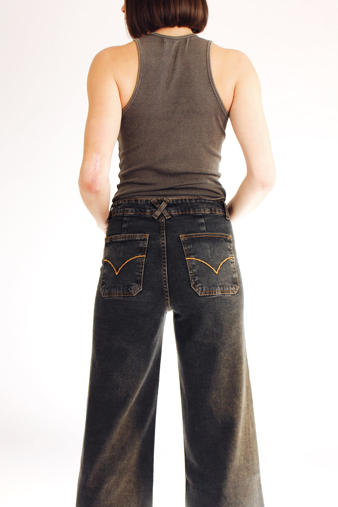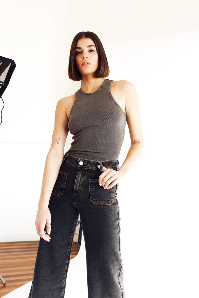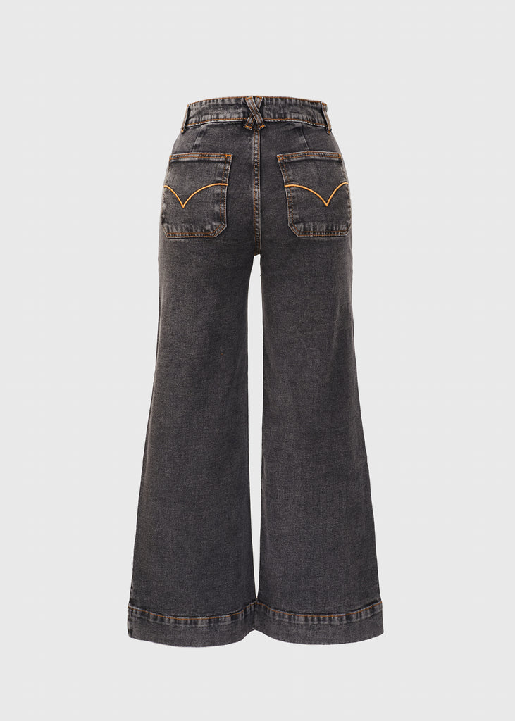 Candela Black es un jeans tiro alto, de pierna amplia y estructura firme que estiliza la silueta y aporta un look moderno y poderoso. Confeccionado en denim negro con sutil efecto desgastado, cuenta con costuras en tono cáscara que contrastan y realzan su diseño.