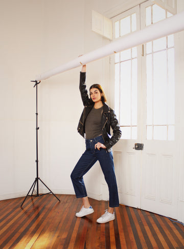 En denim raw (también conocido como denim crudo) elaborado con 100% algodón, tiro alto y un favorecedor corte crop.